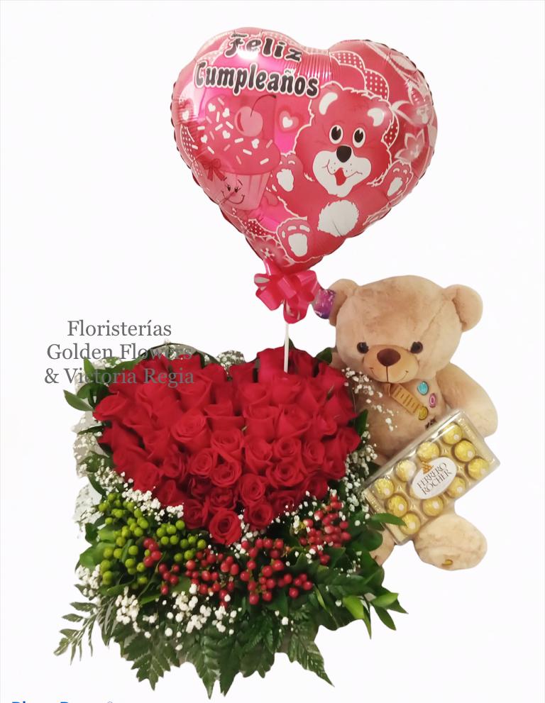 Mediano x 36 Rosas, Oso 28 cmts, chocolate Ferrero x 8 y globo 9″