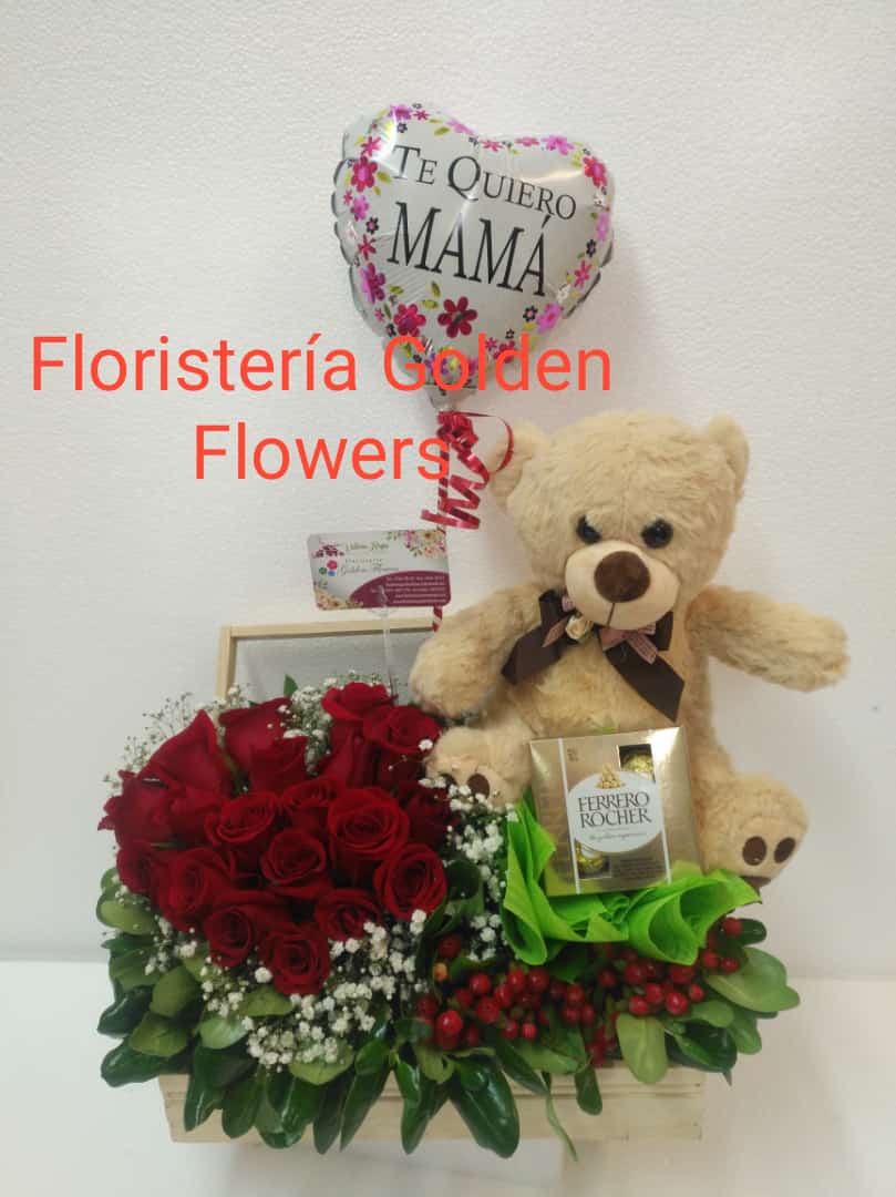Pequeño x 24 rosas, Oso 19 cmts, chocolate Ferrero x 4 y globo 4″